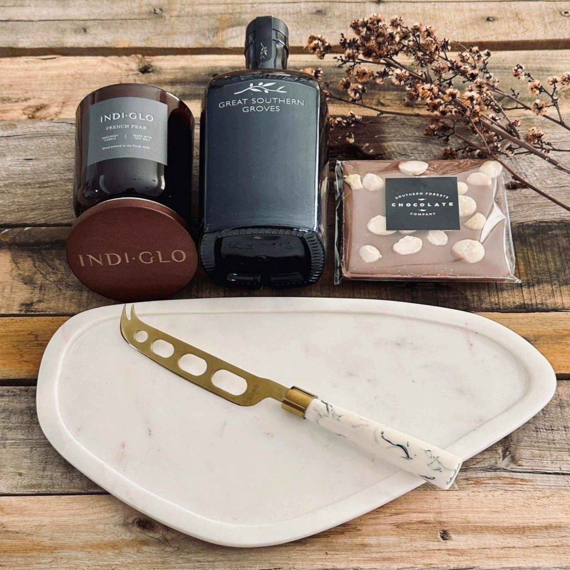 Effortlessly chic, this gold cheese knife is a must have for the stylish entertainer that will be sure to impress your guests at your next soiree. Made from stainless steel with a food-safe gold finish and a chic monochrome marbled resin handle, this stylish gold cheese knife will add a bit of sophistication to your next soiree and pairs perfectly with the marble platter!