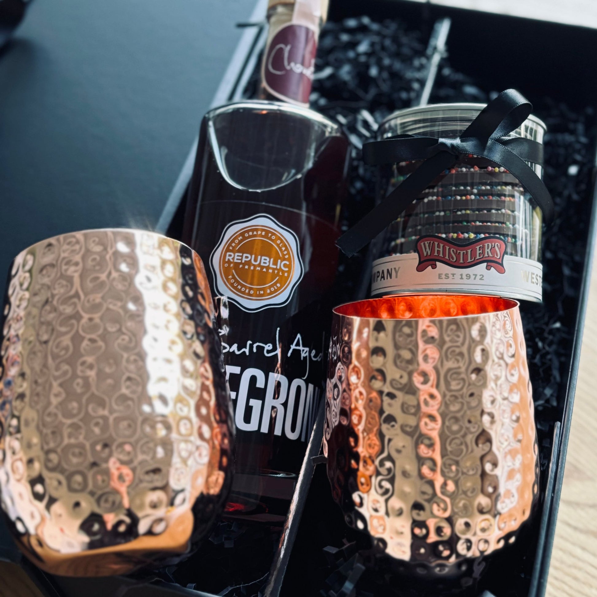 Spice up your evenings at home with a barrel-aged negroni, trendy stemless copper glasses, and a delicious sweet treat!