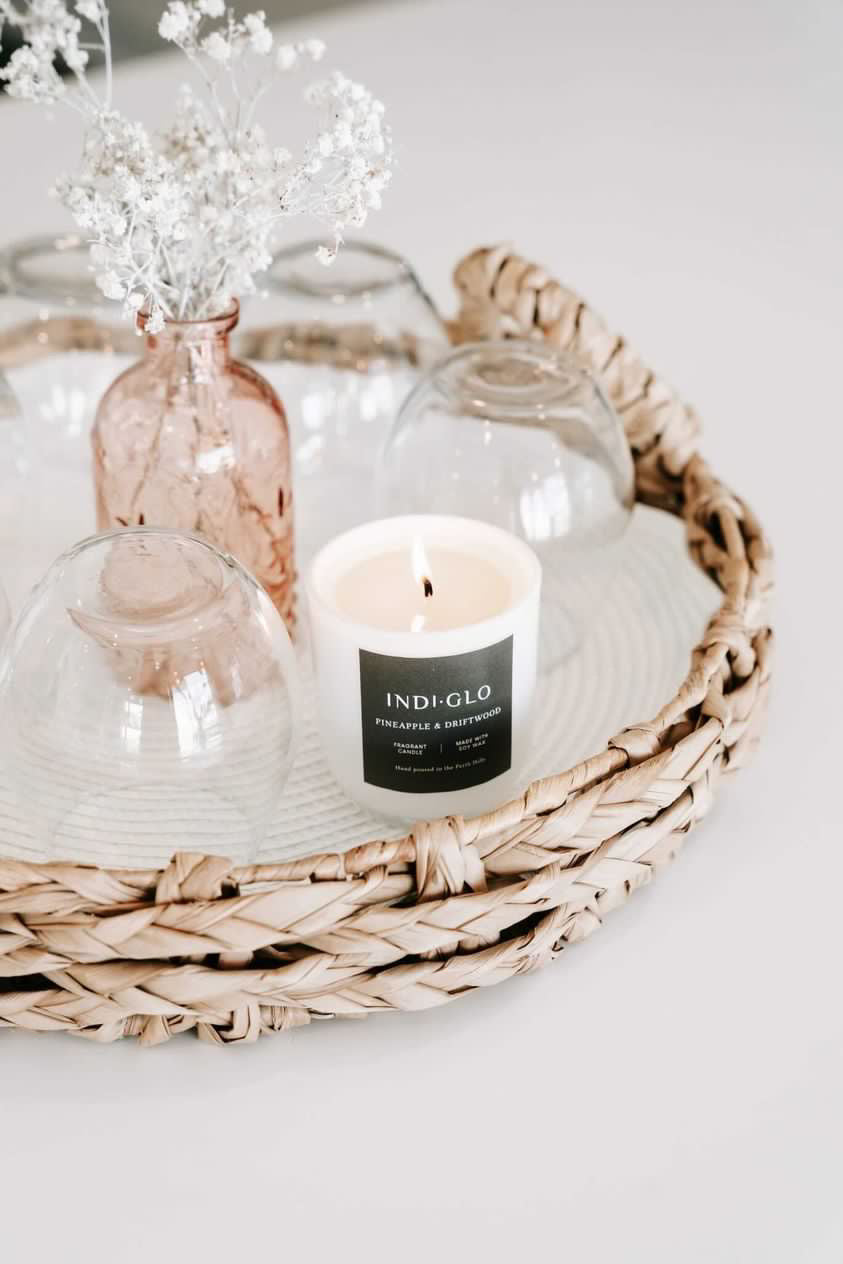 A hand-poured soy wax candle that creates a simplistic yet elegant ambiance, enhancing any space with its warm glow and alluring fragrance. Poured into reusable glassware.